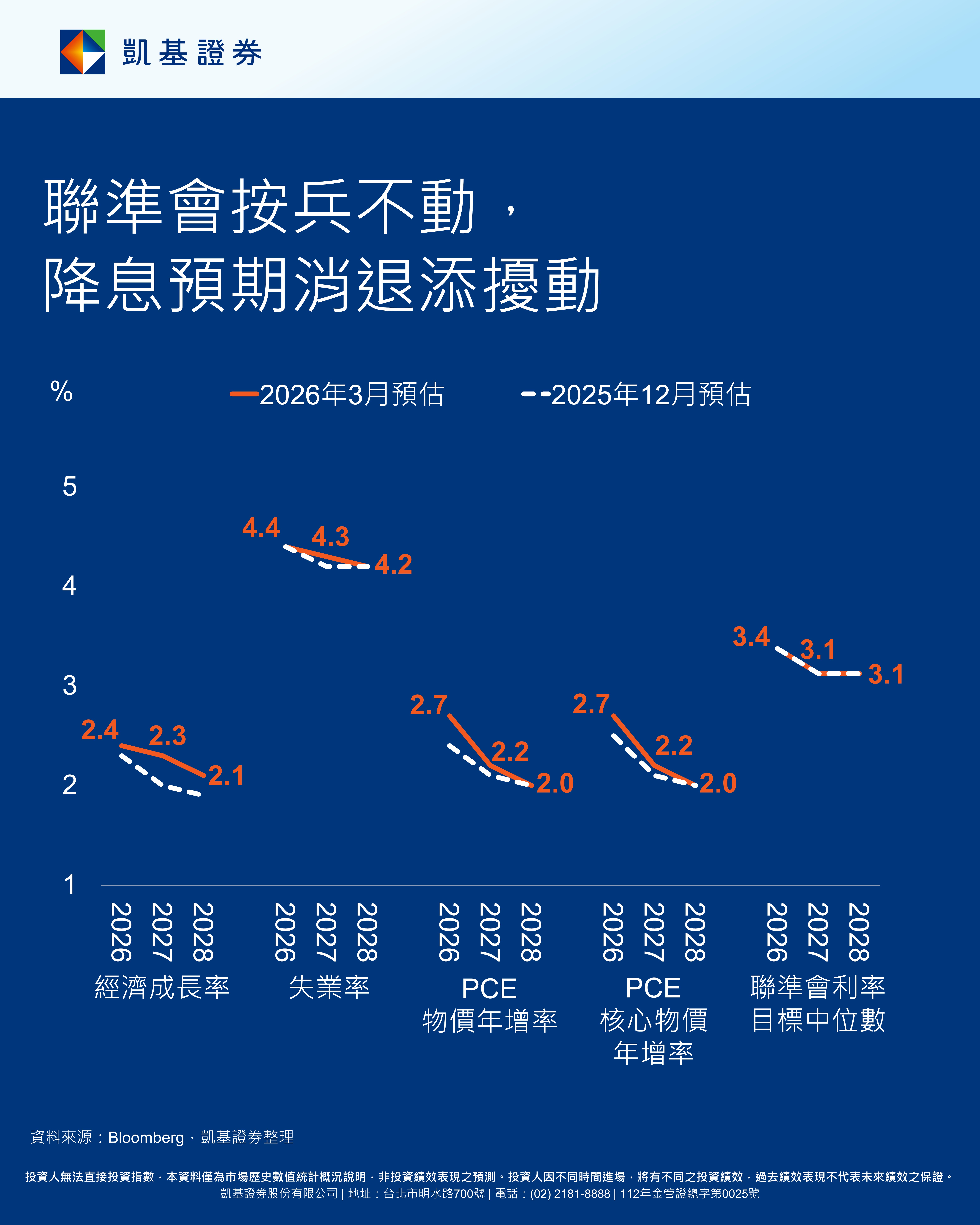 3月FOMC利率決議按兵不動符合市場預期,Fed經濟展望顯示,聯準會官員上調今年至後年以及長期GDP成長預期,上修今明兩年PCE物價及核心PCE物價預期與調升明年失業率預期,並強調中東局勢帶來不確定性,利率點陣圖維持今、明年各降息一碼空間,但官員預估分布有所上移,市場預期美國降息恐延至明年,主席鮑威爾強調關稅與油價推升通膨風險,就業市場出現放緩跡象,關注私部門就業零成長後續變化。