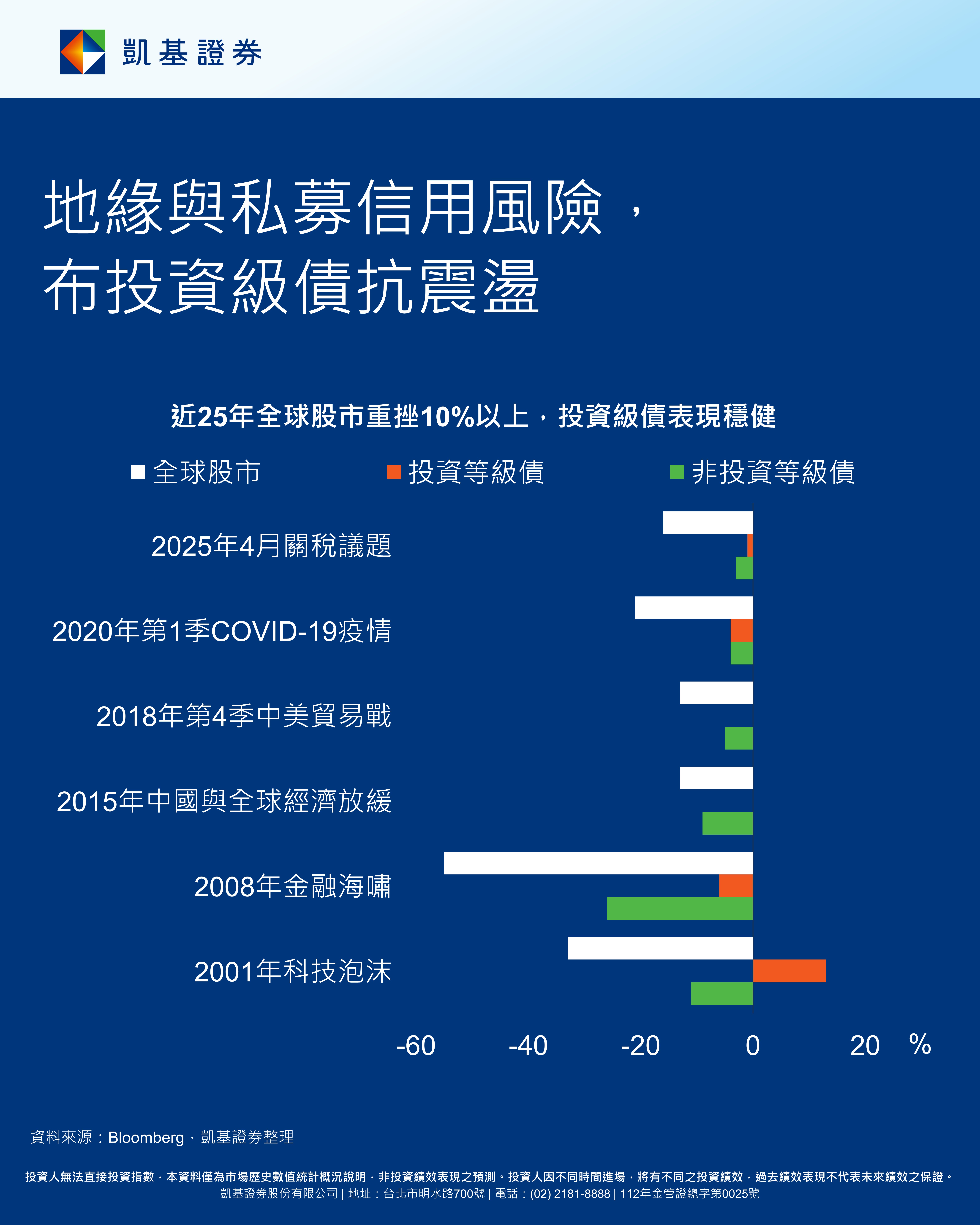 市場原先期待的降息預期消退,第二季美國公債殖利率存在走升可能,短線交易者待美債利率大幅走升布局,考量政府債務供給難題仍在,高信評企業債信體質較佳且具防禦能力,投資人宜專注投資級好債鎖利契機,另過往股市重挫時期,投資級債表現相對穩健。考量中東地緣衝突爆發,私募信貸問題頻傳,投資級債的好票息提供穩定金流因子,布局債券投資人首選中短天期投資級債,降低現金流不確定性。