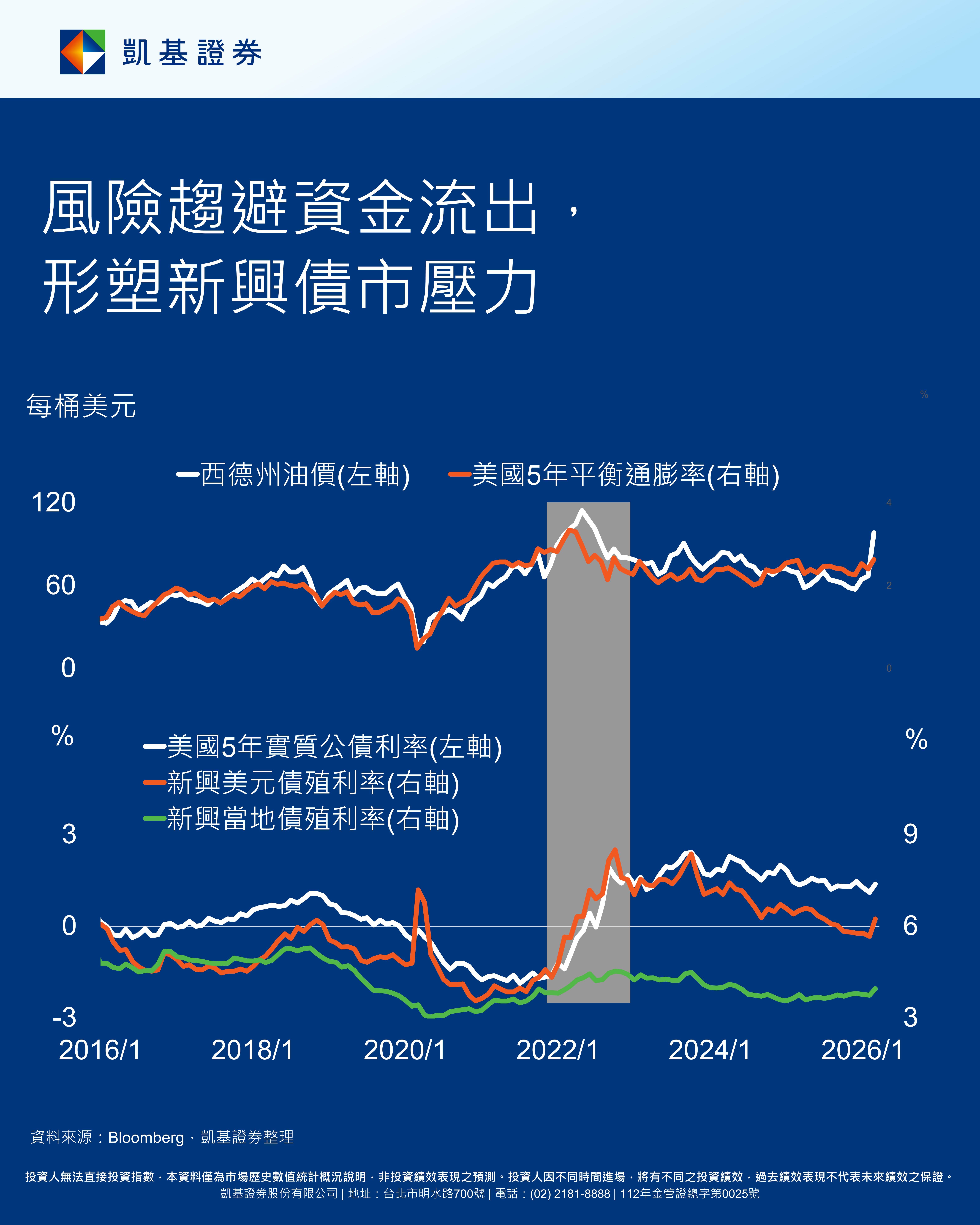 今年以來新興債表現承壓,其中成因包含:(1)伊朗衝突升溫,風險趨避導致資金流出歐非中東新興市場,(2)避險需求與美國降息預期消退,資金從非美國家回流美國,並推升美元走強,(3)當前新興市場違約率雖低,然部分新興國家貨幣政策轉向升息,為新興市場債壓力另一成因,假設地緣衝突短期難消退,造成油價維持每桶100美元高位,同時推升美國實質公債利率,恐致2022年市況重演,欲投資新興債者,宜衛星配置持盈保泰。