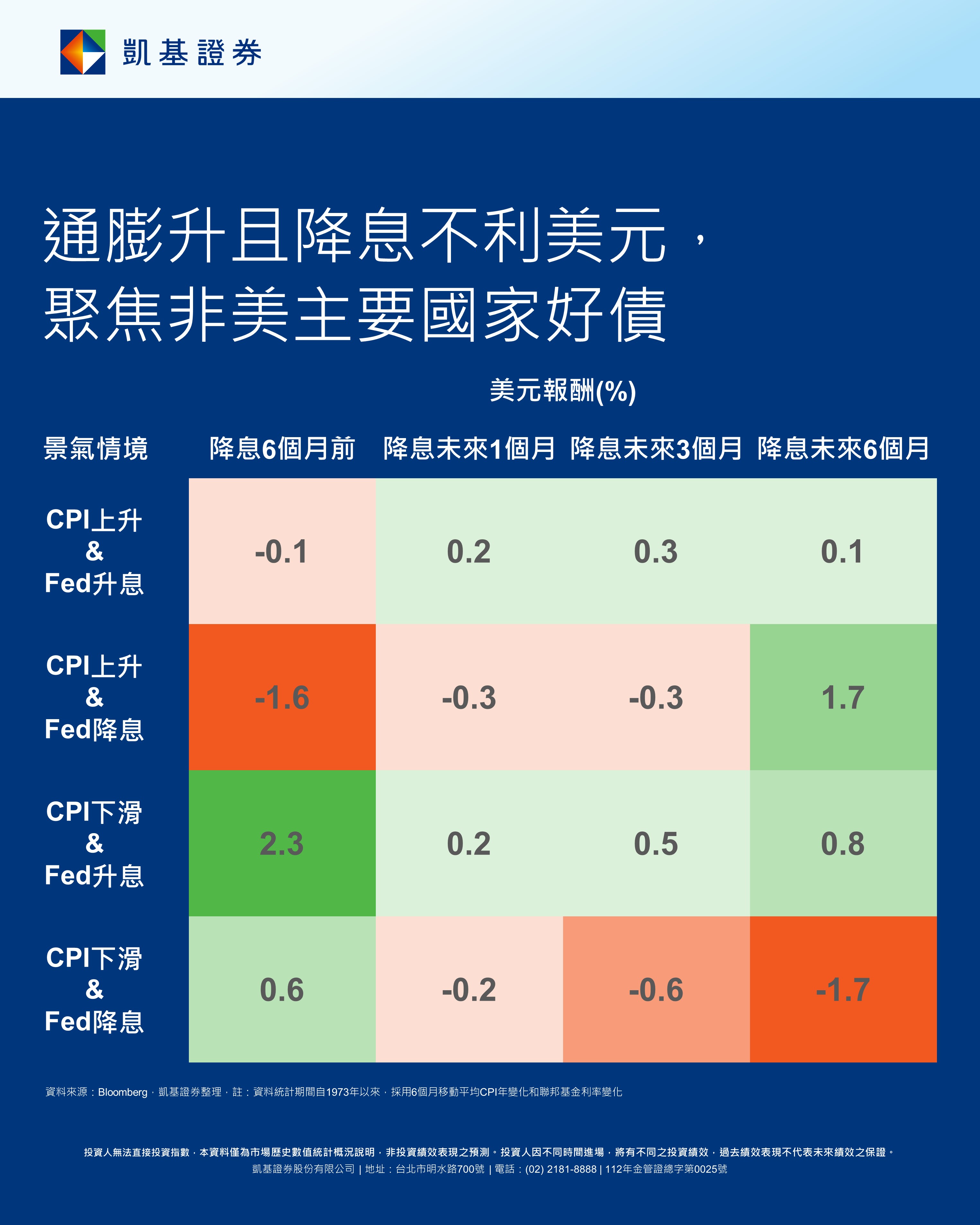 當前美國景氣處於通膨高於長期平均且聯準會已進入降息循環,統計1973年來美元指數於通膨上升且Fed降息的期間報酬,於降息前6個月明顯偏貶,顯見通膨上升且聯準會降息情境,可能限縮實質政策利率,另考量美國大而美法案讓政府債務問題難消,導致美元存在貶值可能,建議可趁降息前,布局歐元、英鎊、新加坡幣等非美貨幣好債分散曝險。