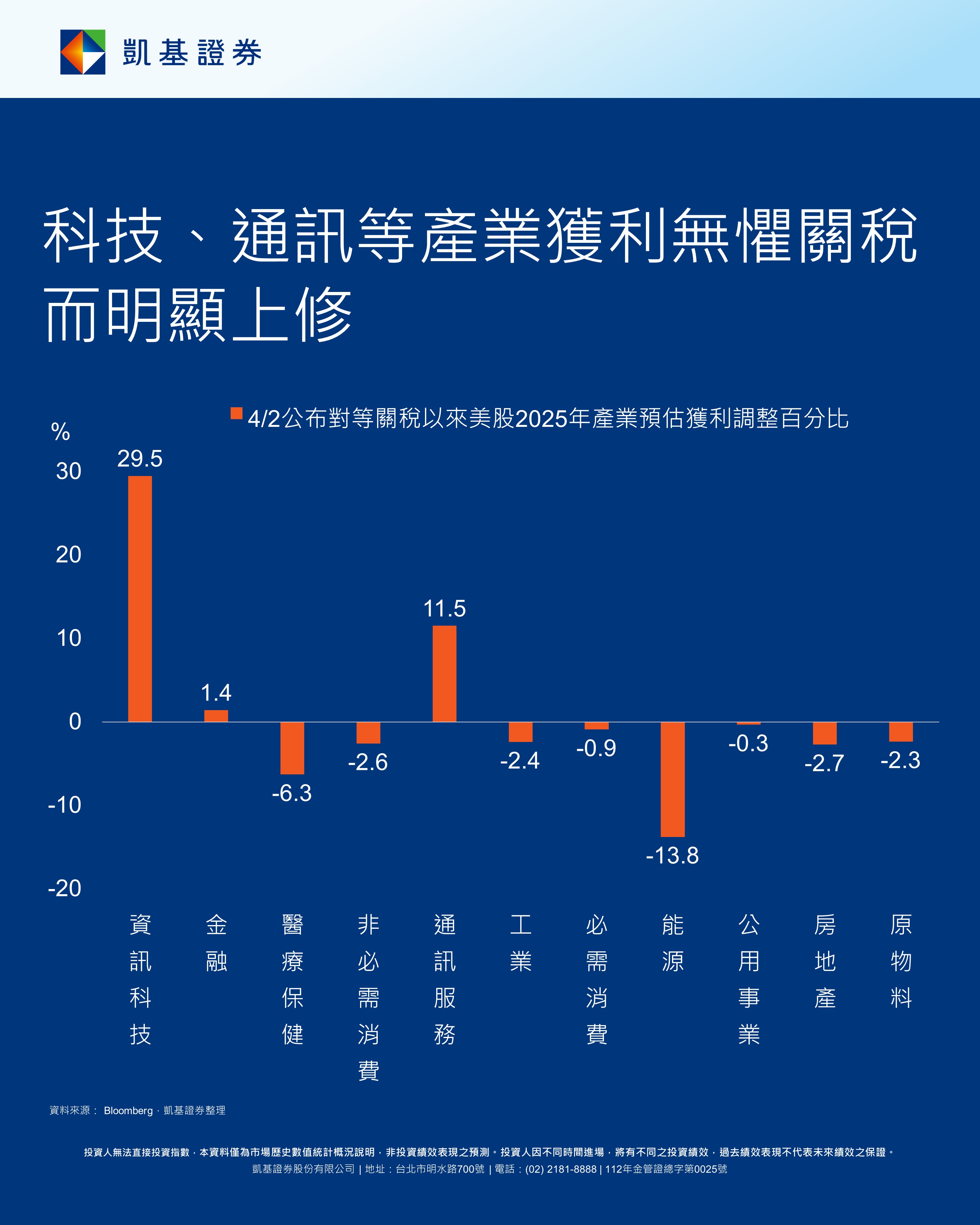 觀察上半年的提前拉貨潮逐漸趨緩,該效應亦將慢慢地遞延至美國本土消費。另一方面,關稅的全面影響尚未顯現,反映目前企業運用多種應對措施而建立的緩衝。隨著8月7日起,平均關稅將從暫緩期的10%升至20%左右,負面影響恐趨於顯著。可留意對等關稅公布以來仍能取得獲利上修的科技與通訊產業之長期機會,並可搭配高品質股以抵禦市場波動風險。