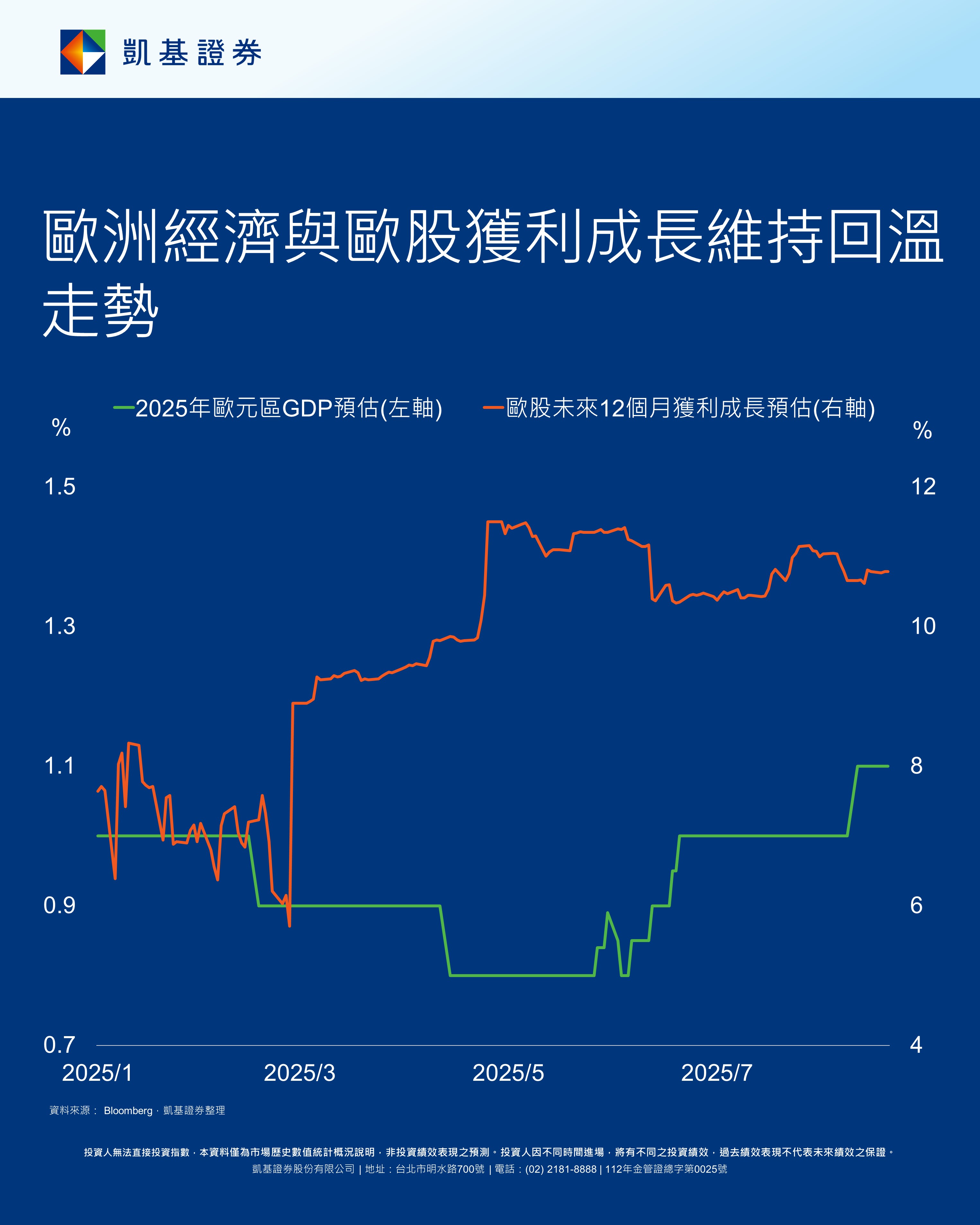隨著美歐達成初步貿易協議,關稅稅率降至15%,包括半導體、汽車和藥品也適用的資訊被明確列在美國官方文件當中,令歐元區貿易政策不確定性明顯降溫。其中財政轉向擴張,貿易談判降低汽車稅率將使德股相對有利。此外,英國擁低關稅之優勢,加上英股具備防禦特性,隨歐股回檔時,可留意德、英股市之布局機會。
