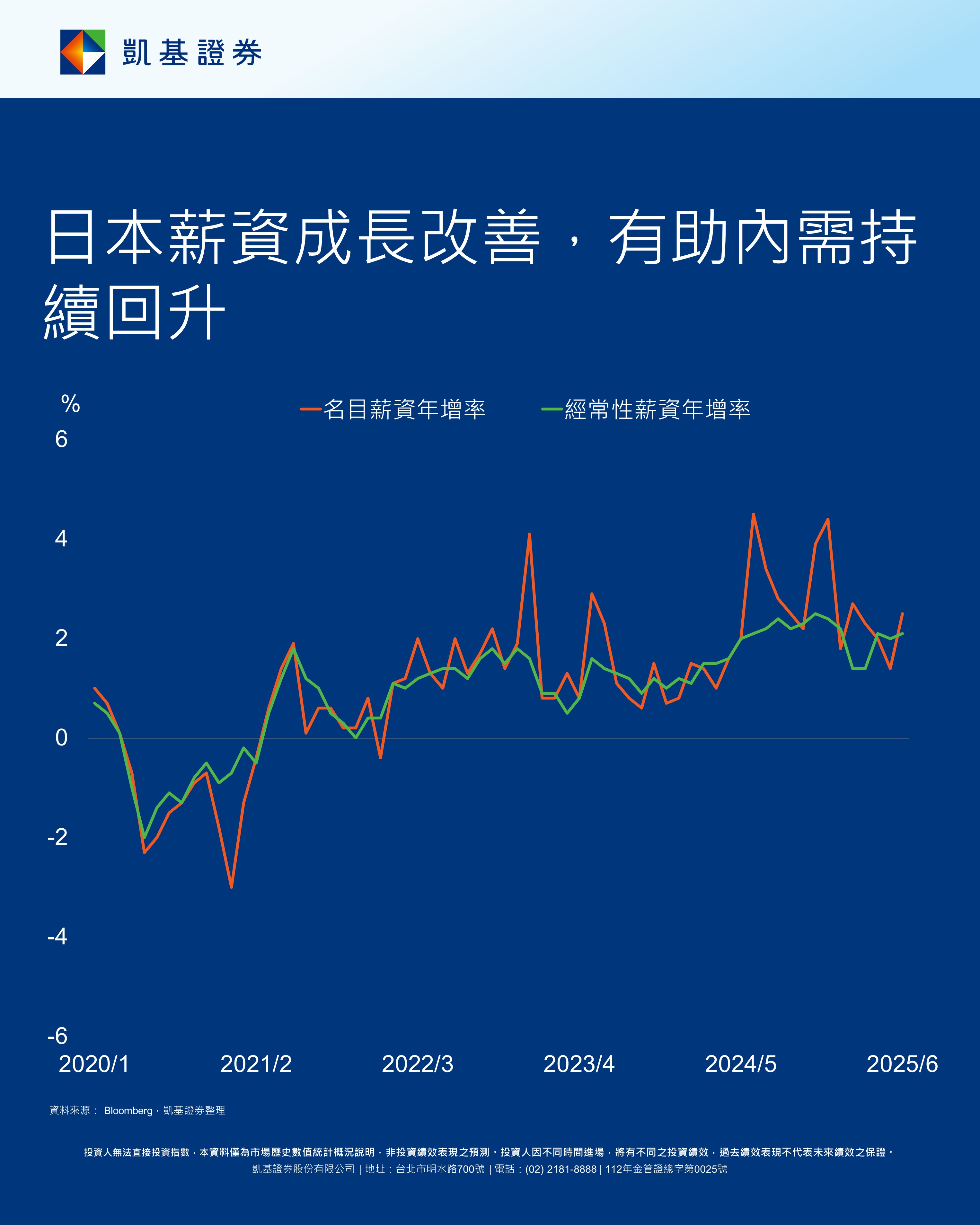 日本薪資成長數據走勢邁向改善,加上最新公布之日本第二季GDP季增率為0.3%、年化季增率亦升至1.0%,亦優於前值和市場預期。其中消費、投資、淨出口皆為正貢獻,且表現均比預期更佳,顯示薪資推動消費的正向循環有望延續。此外,貿易不確定性降溫有利於日本央行再度升息,將可望帶動以銀行類股為首的內需產業後續表現。