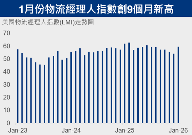 📌美國2026年1月份物流經理人指數(LMI)自54.2上升至59.6,創下2025年5月以來的最快增速,報告中表明1月份的冬季風暴限制了運力,並推動運價上漲,也帶動年初至今美國運輸類股表現強勢,創下歷史新高。