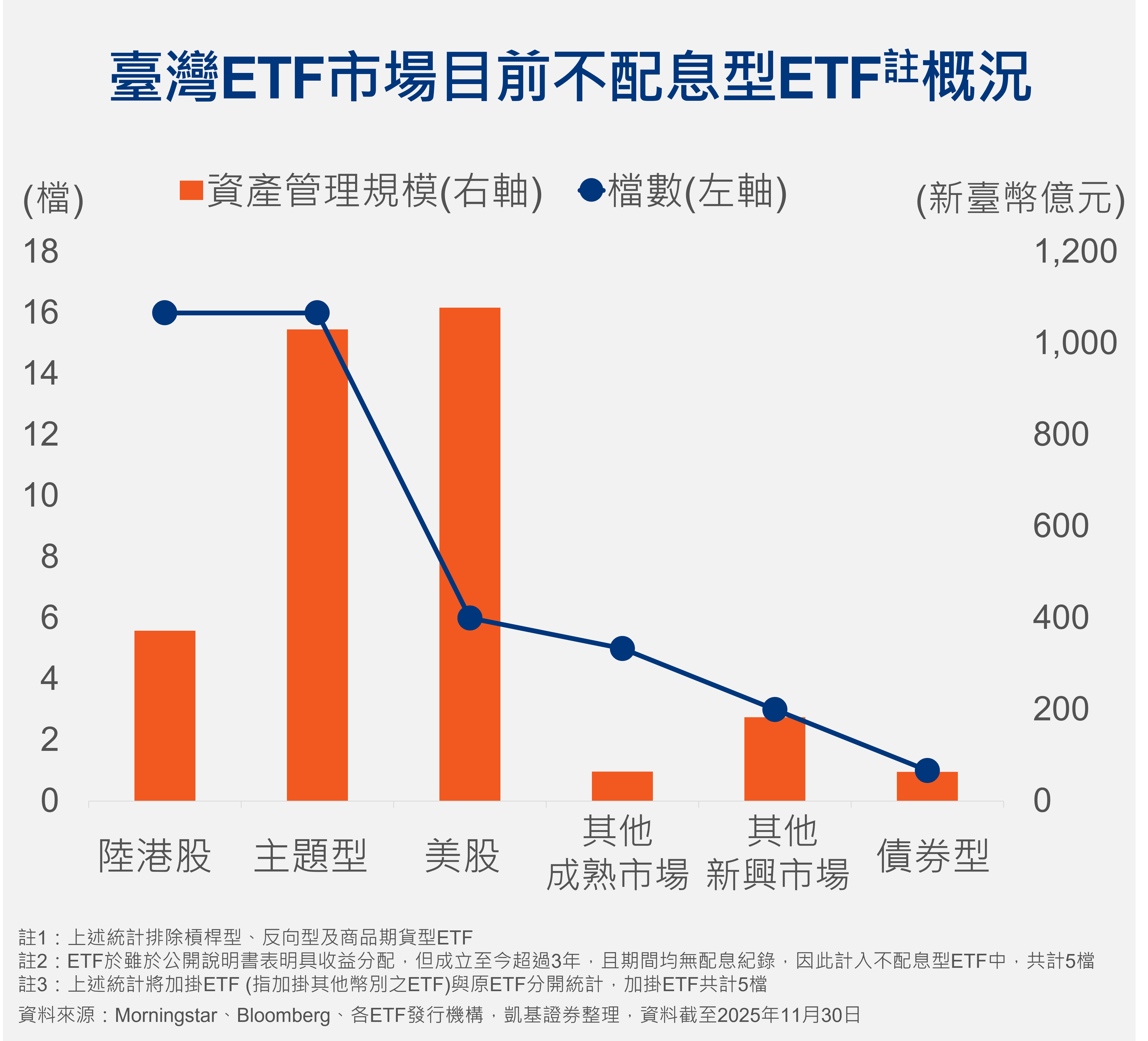 近期隨著首檔不配息型台股ETF即將募集,「不配息型ETF」於臺灣ETF市場上掀起討論,其實,不配息型ETF並非新型態的ETF結構,根據統計,截至2025年11月,臺灣ETF市場上共有將近50檔不配息型ETF,但有超過半數的ETF集中在陸港股及主題型ETF中。而臺灣ETF市場有將近半數的資產管理規模落在國內股票型ETF,因此首檔不配息型台股ETF的募集也獲得關注。