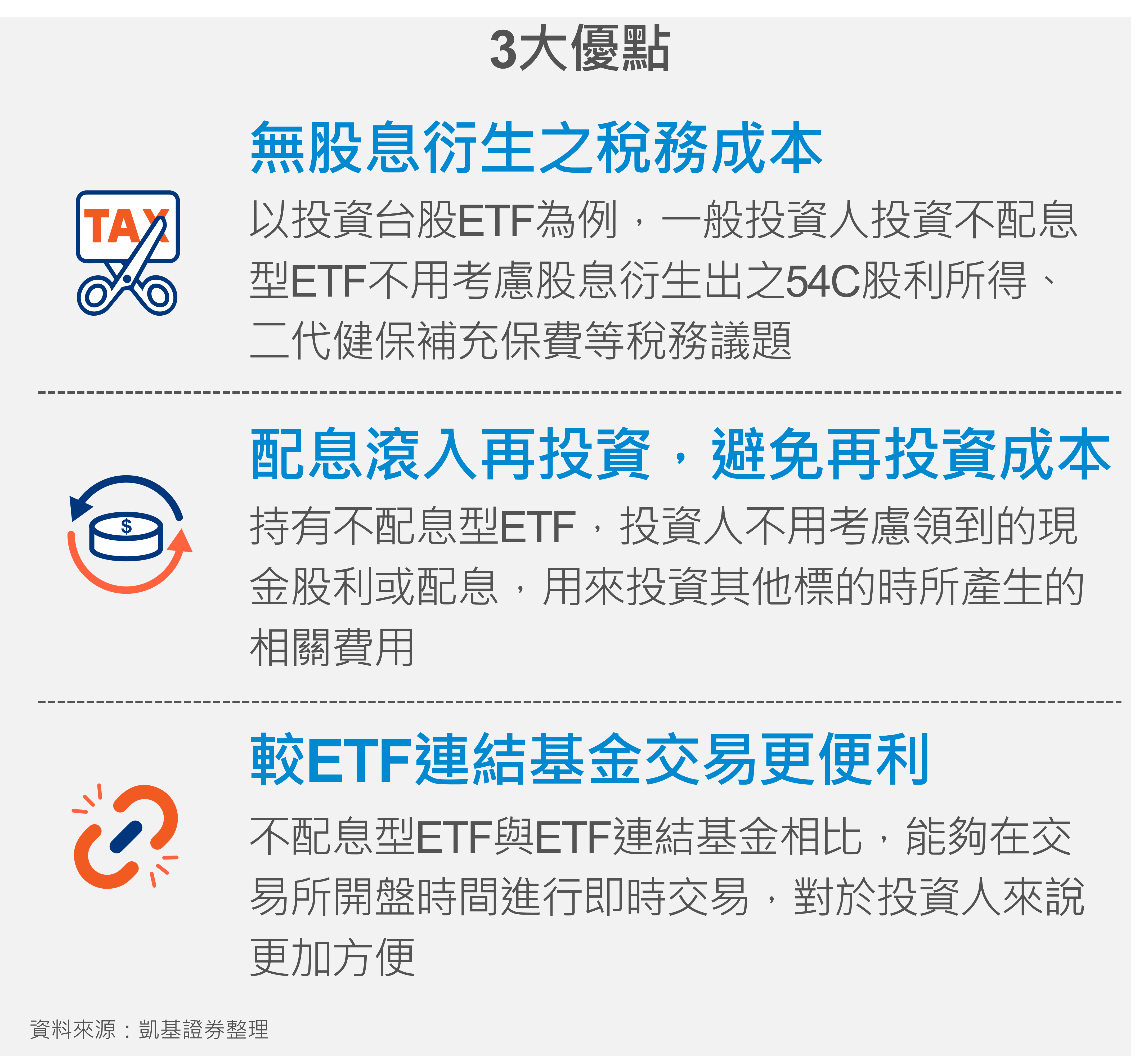 不配息型ETF大致上可以規納出三大優點,第一是「避開股息衍生之稅務成本」:以投資台股ETF為例,一般投資人投資不配息型ETF不用考慮股息衍生出之54C股利所得、二代健保補充保費等稅務議題;第二是「配息滾入再投資,避免再投資成本」:持有不配息型ETF,投資人不用考慮領到的現金股利或配息,用來投資其他標的時所產生的相關費用;第三則是「較ETF連結基金交易更便利」:不配息型ETF與ETF連結基金相比,能夠在交易所開盤時間進行即時交易,對於投資人來說更加方便。
