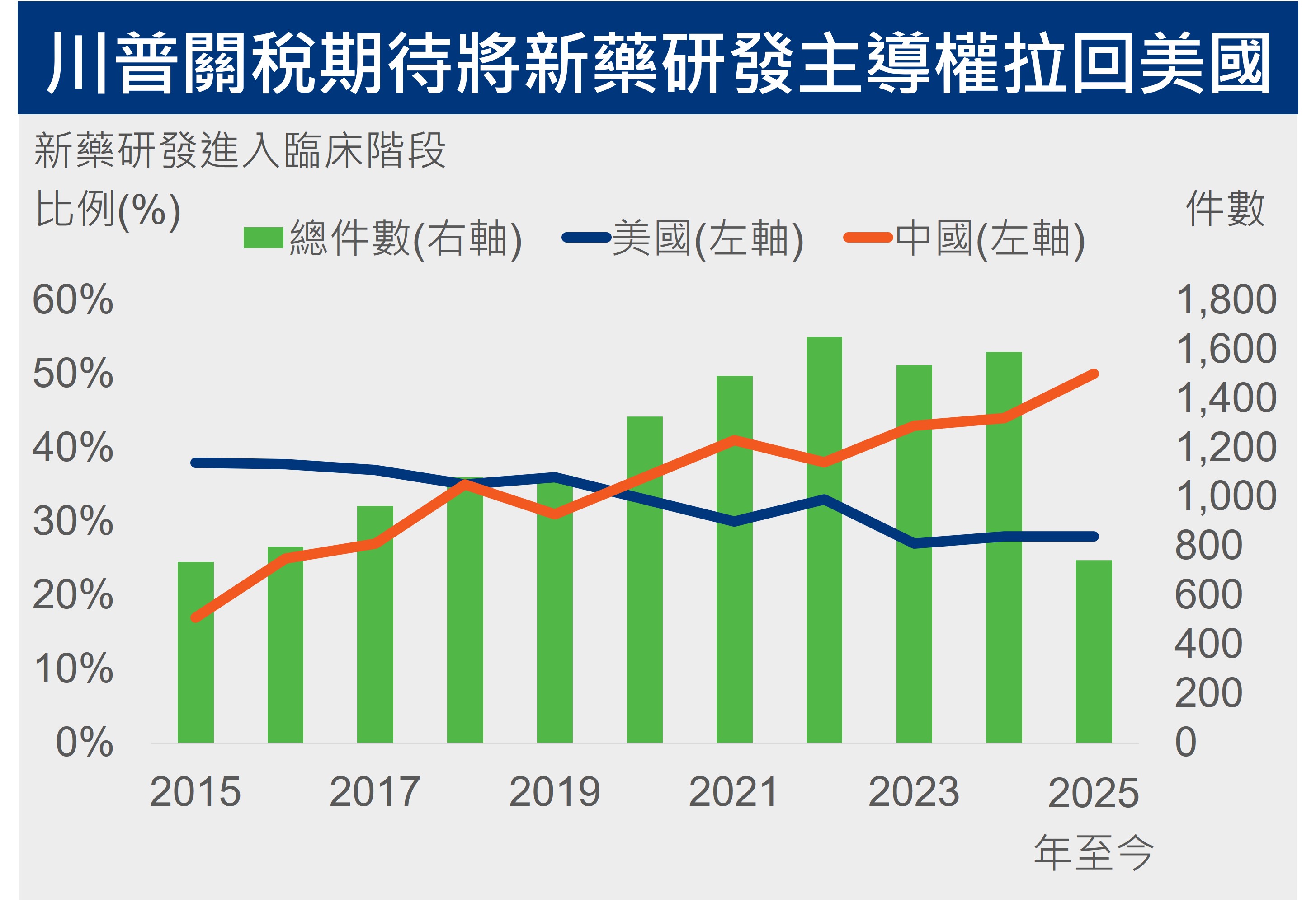 📌川普一度宣稱對藥品課徵高額關稅,除了不滿藥廠對美差別訂價外,美國新藥研發能力不斷下降,於2019年與中國產生死亡交叉,至2025年佔比28%,對比中國新藥進入臨床案件比重50%大幅落後。全球各大藥廠目前看來將回美國設廠製造與研發,輝瑞首先同意降低藥價,並承諾700億美元投資研發與製造換取3年關稅豁免。隨後英商阿斯特捷利康也於10月10日降藥價並投資500億美元落實美國製造。藥廠研發多透過併購與合作生產,美國新創藥研發公司可同步受惠。