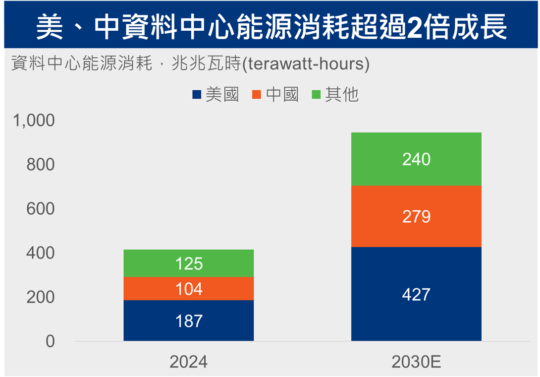 📌除了晶片算力,電力供給成為AI發展主要限制。美國資料中心的電力需求至2030年預估至少需要427兆兆瓦時,占全球資料中心用電的45%,中國也占了約25%需求量。由於AI模型訓練時,電力需求會在短時間內飆升,穩定、密集電力供應為未來主流。