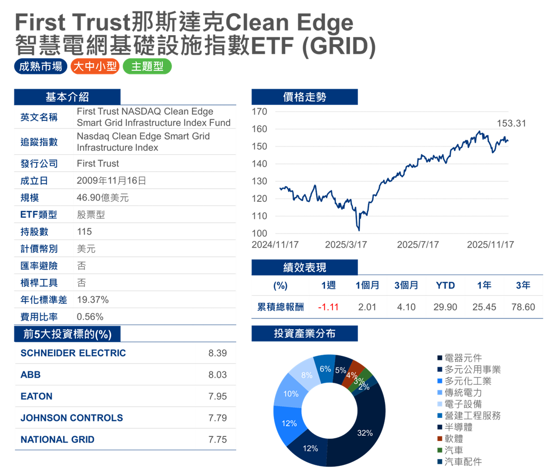 註:上述ETF為美國市場上市ETF,以乾淨智慧電網基礎建設(Clean+ Grid Infrastructure)相關主題ETF,且投資對象包含全球(不僅僅是投資美國)進行篩選得出結果,目前相關ETF僅1檔,資料截止日2025年12月18日。