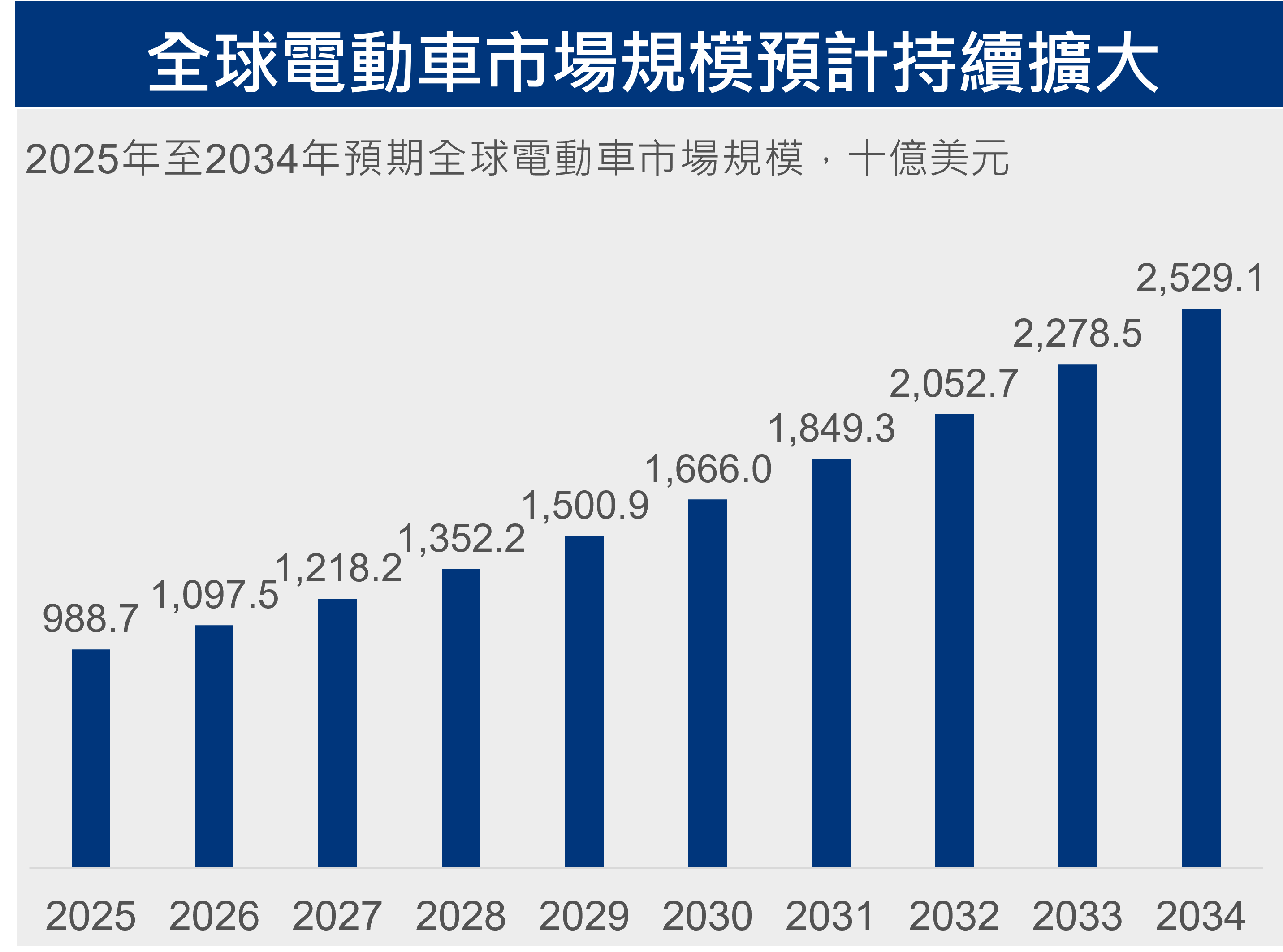 📌根據Precedence Research,全球電動車市場規模預計將從2025年的9,887億美元成長至2034年的2.53兆美元。隨著電動車滲透率持續提升,對鋰離子電池的需求也將同步擴大,進一步推動鋰電池及相關材料的長期結構性成長。