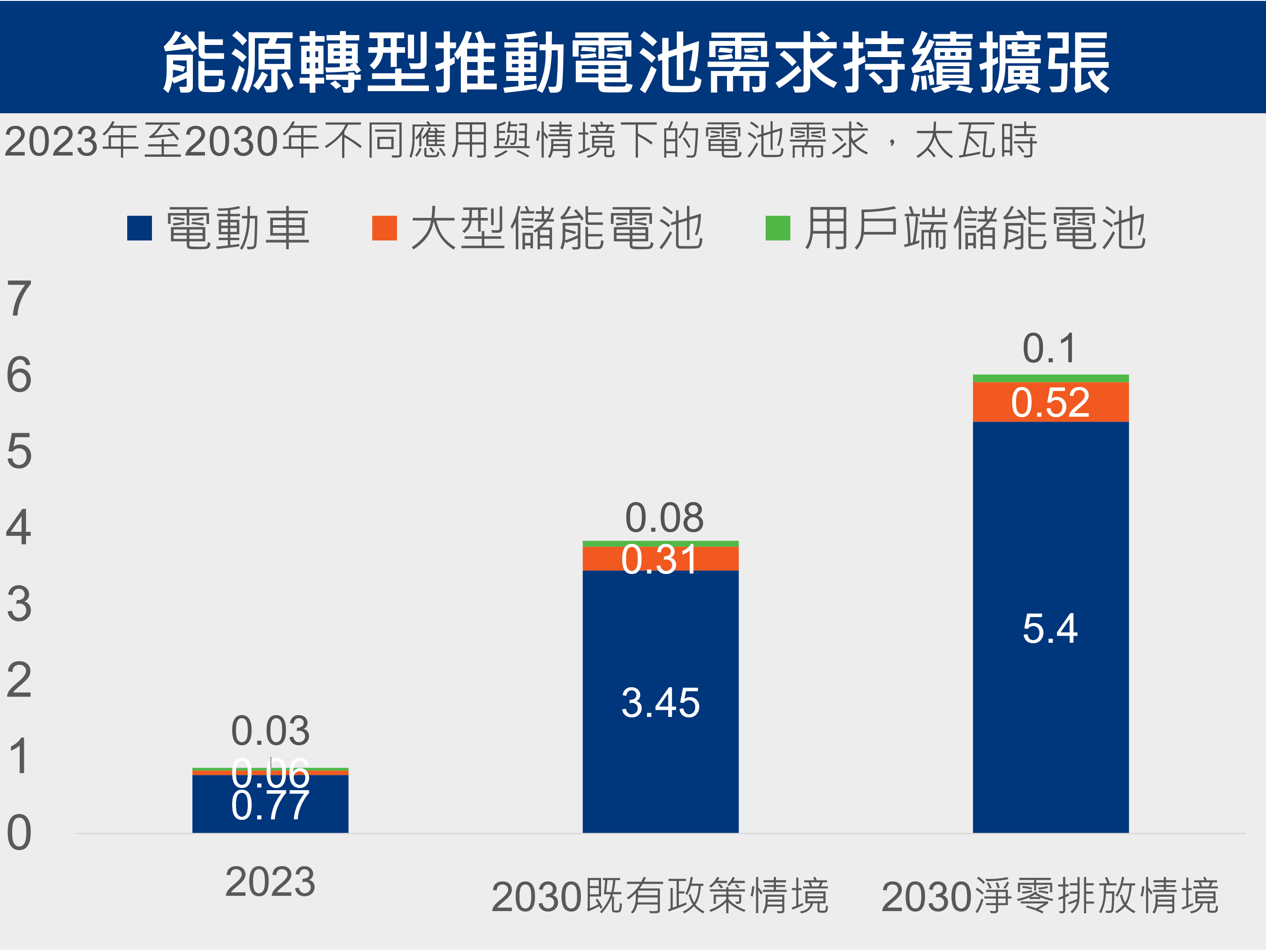 📌IEA資料預計,全球電池需求從2023年至2030年於既有政策情境(STEPS)與淨零排放情境(NZE)下大幅成長。這些需求主要來自電動車與各類儲能系統,而兩者的核心技術均以鋰離子電池為主。在STEPS與NZE情境中,電動車仍是最大需求來源,大型儲能與戶用儲能也同步上升,反映能源轉型正持續推動鋰電池的中長期需求成長。