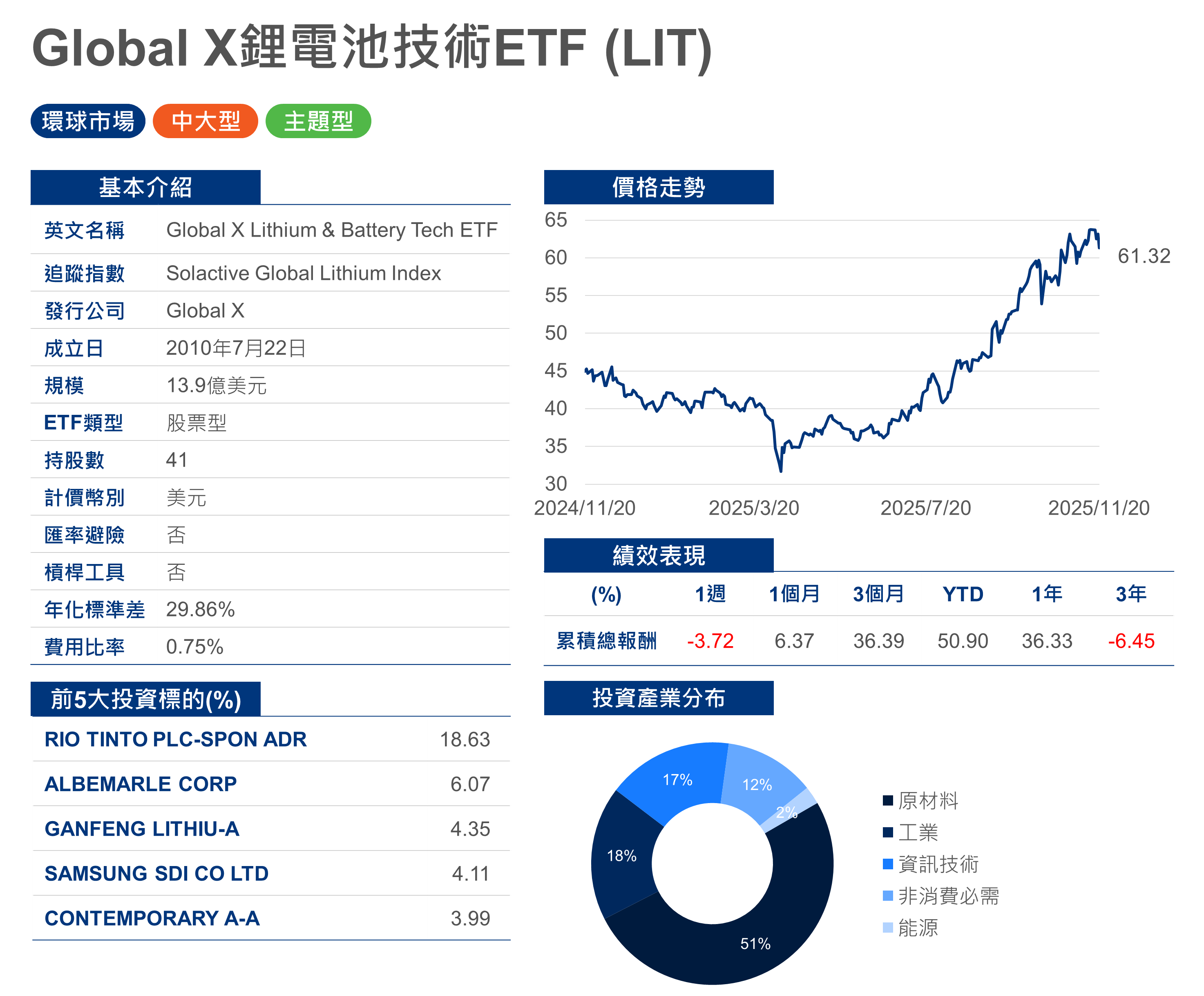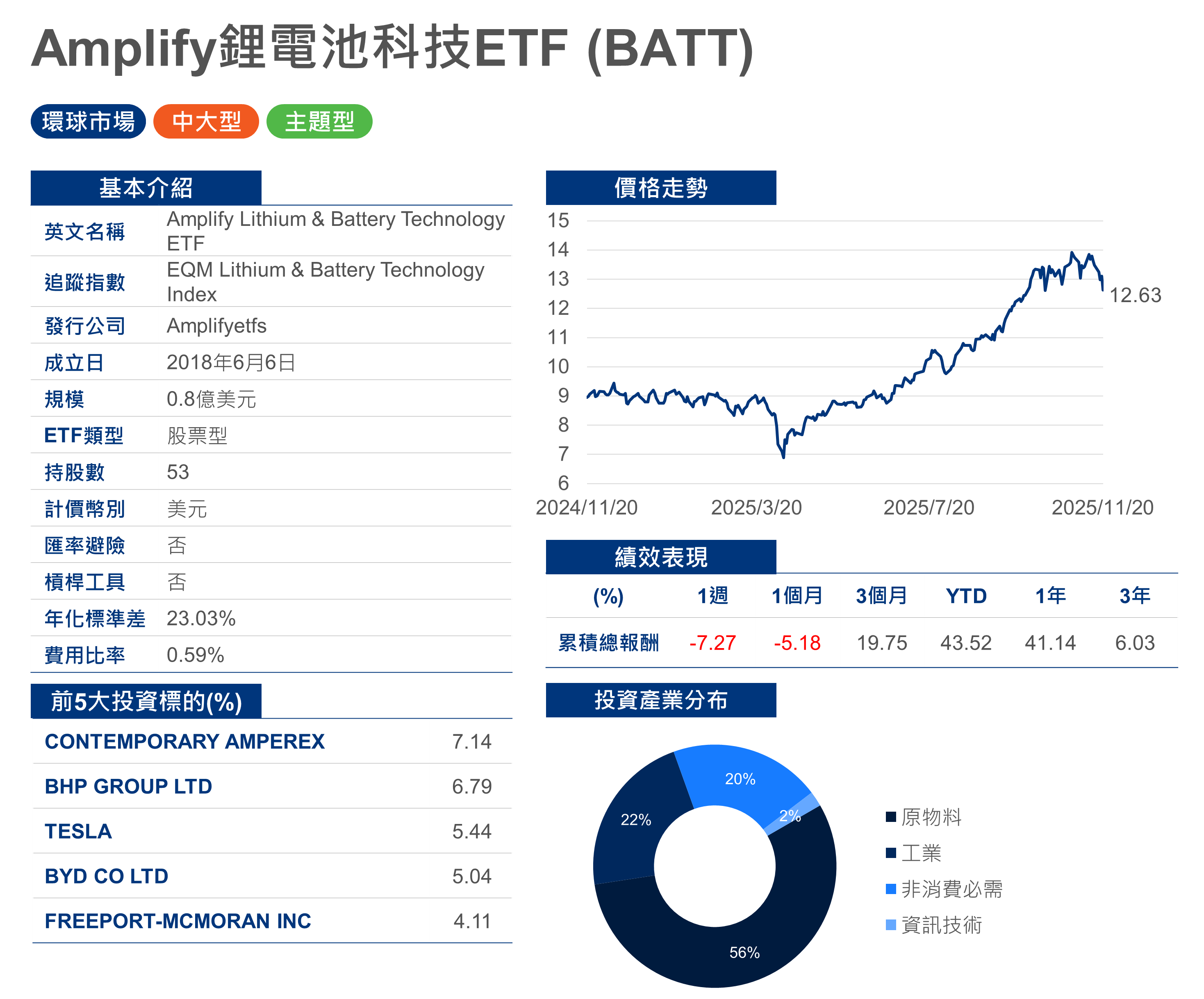 註:上述ETF為美國市場上市ETF,篩選鋰電池ETF資產管理規模最大之2檔ETF,資料截止日2025年11月20日。