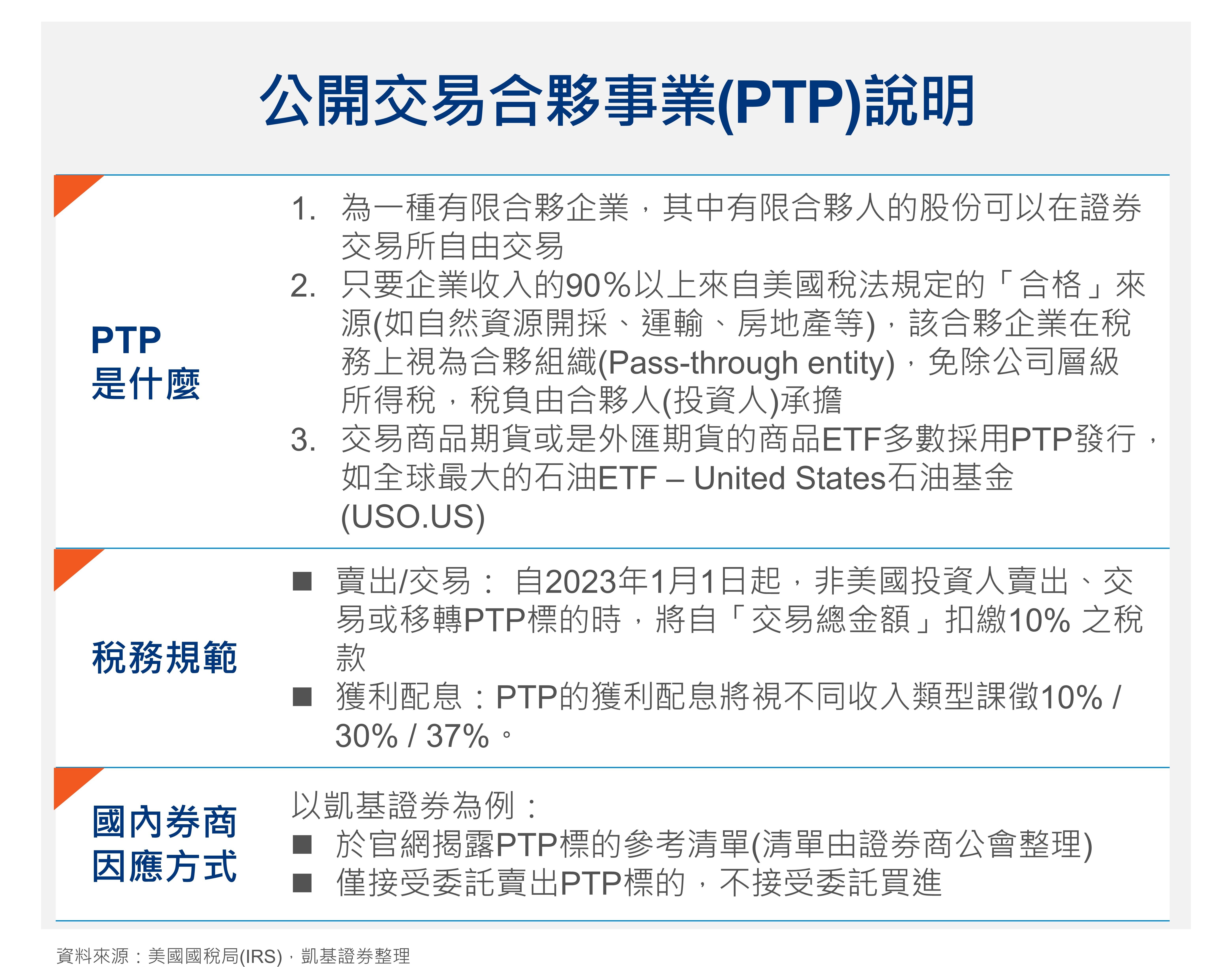 2023年開始,由於美國國稅局(IRS)宣布非美國投資人賣出、交易或移轉PTP標的時,將自「交易總金額」扣繳10% 之稅款,此外,PTP的獲利配息將視不同收入類型課徵10% / 30% / 37%。因此,國內券商(以凱基證券為例)目前採取僅接受委託賣出PTP標的,不接受委託買進的方式應對政策轉變。而在上述政策轉變下,期貨信託ETF可作為部分美國市場掛牌公開交易合夥事業(PTP) ETF替代工具,如像黃豆、外匯等相關的ETF,在美國仍屬於PTP ETF,便可以選擇期貨信託ETF作為替代工具。