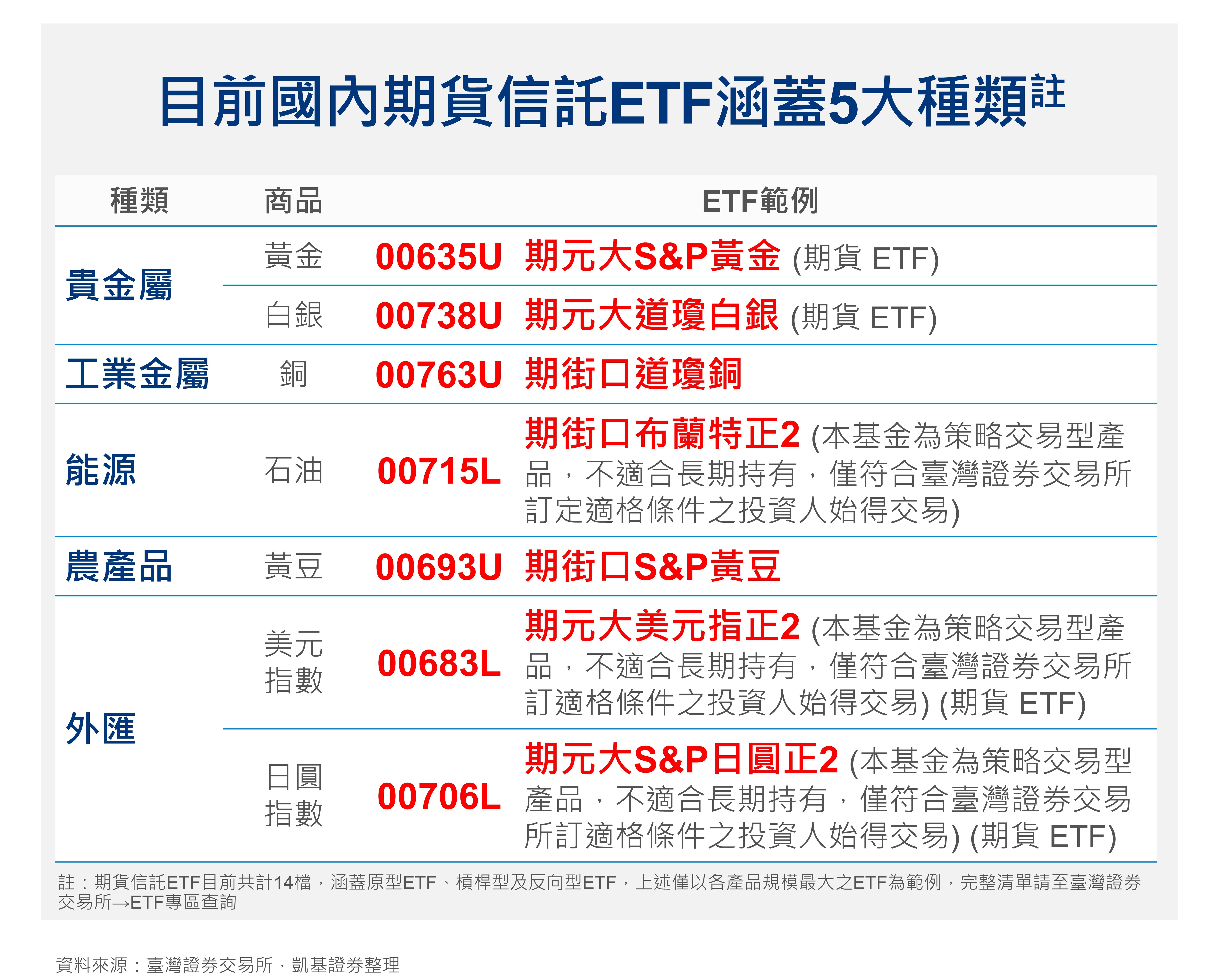 目前國內期貨信託ETF涵蓋貴金屬、基本金屬、能源、農產品與外匯5大類,共計7項商品,包含黃金、白銀、銅、石油、黃豆、美元指數及日圓指數之相關期貨指數,共計14檔ETF,包含原型ETF、槓桿型及反向型ETF。除了作為部分美國上市PTP ETF的替代工具外,習慣以臺灣上市的基金、ETF作為投資工具的投資人,也可藉由國內期貨信託ETF來參與原物料或外匯市場的表現。