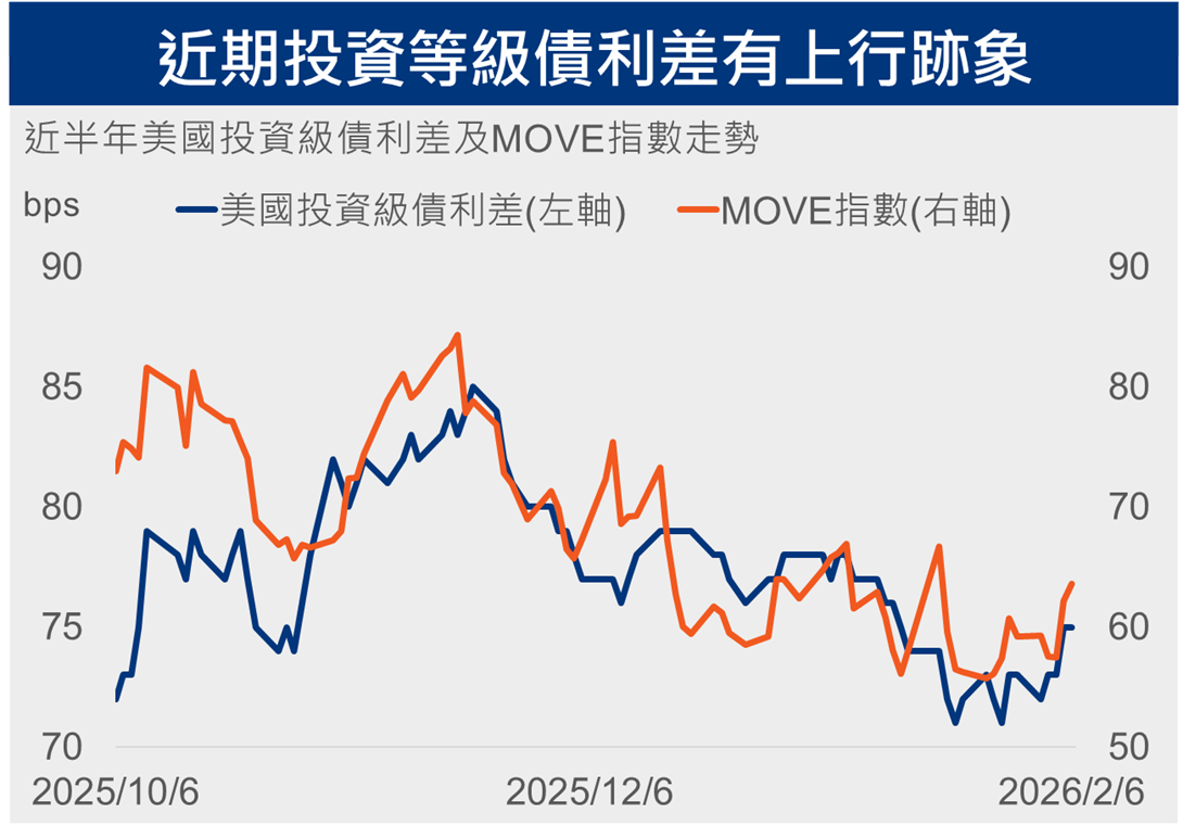 📌近期美國投資等級債利差呈現溫和走升,反映市場對信用風險的要求提高,但整體仍處於歷史可控區間,顯示基本面維持穩健。同時,MOVE指數近期亦微幅走升,顯示在利率政策與經濟數據不確定性下,債市波動度略有抬升。在利差提供收益緩衝、且債券價格上行空間相對受限的環境中,投資級債券搭配掩護性買權策略,可在不需押注債券價格上漲的情況下,增加投組的收益來源,並有助平衡整體報酬結構。