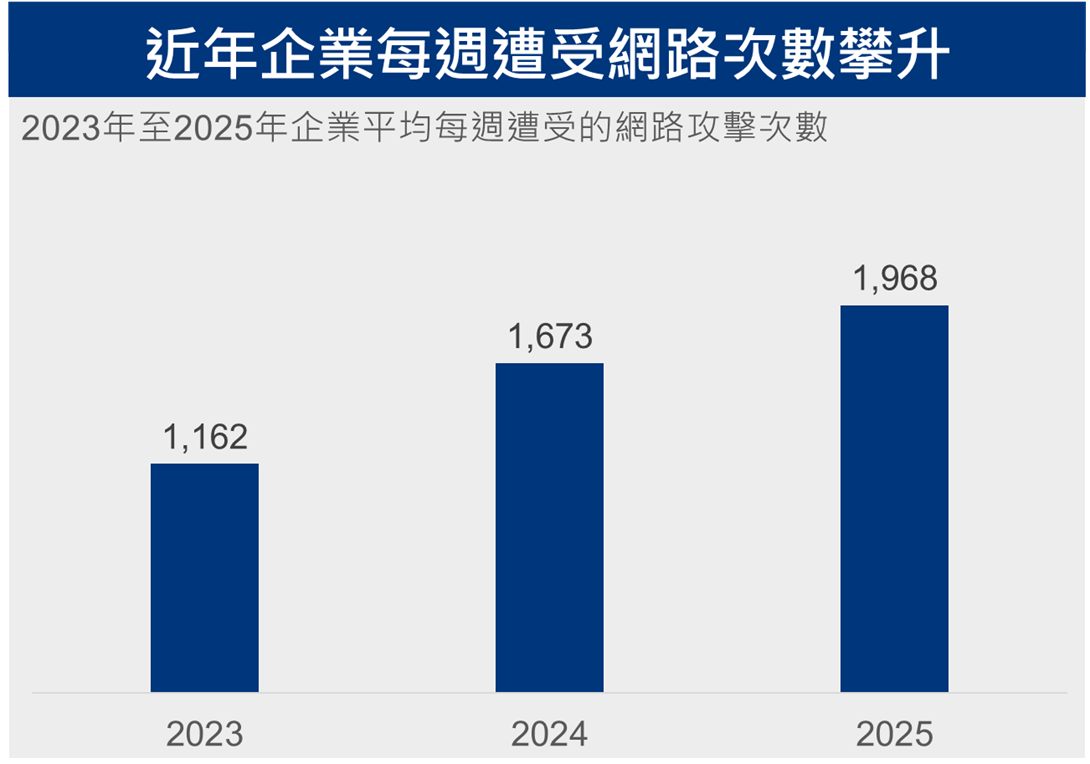 1️⃣ 2025年企業平均每週面臨約1,968次網路攻擊,較2023年大幅增加近70%