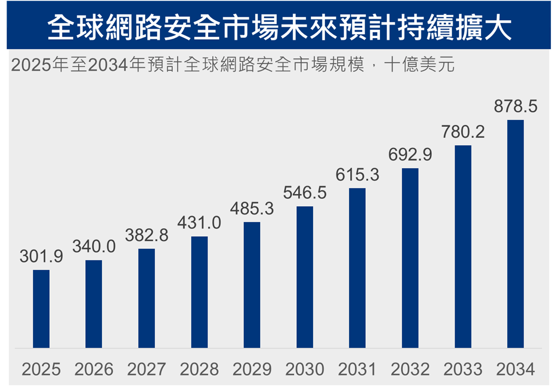📌隨著AI技術快速發展,企業數位化程度持續提高,同時也使網路攻擊手法更加多元與複雜,進一步帶動企業對網路安全防護與資安解決方案的需求。根據Precedence Research研究,全球網路安全市場規模預計將由2025年的3,019億美元成長至2034年的8,785億美元。