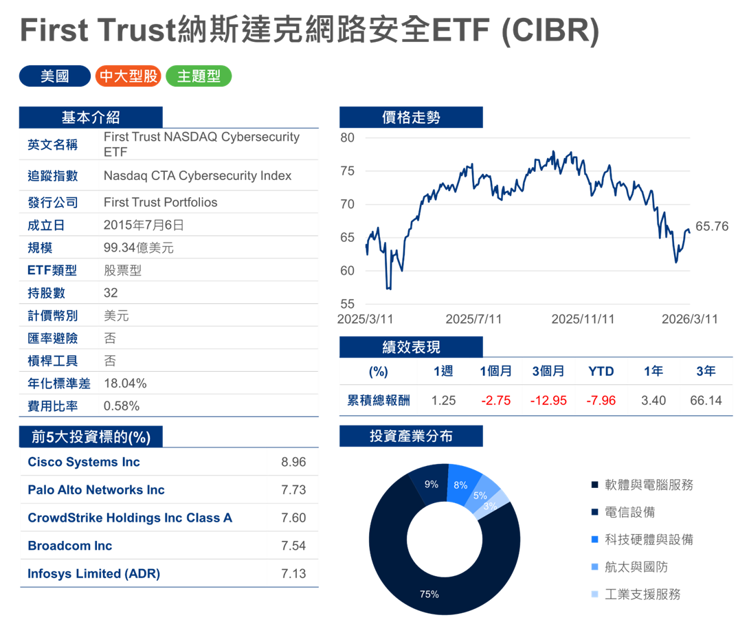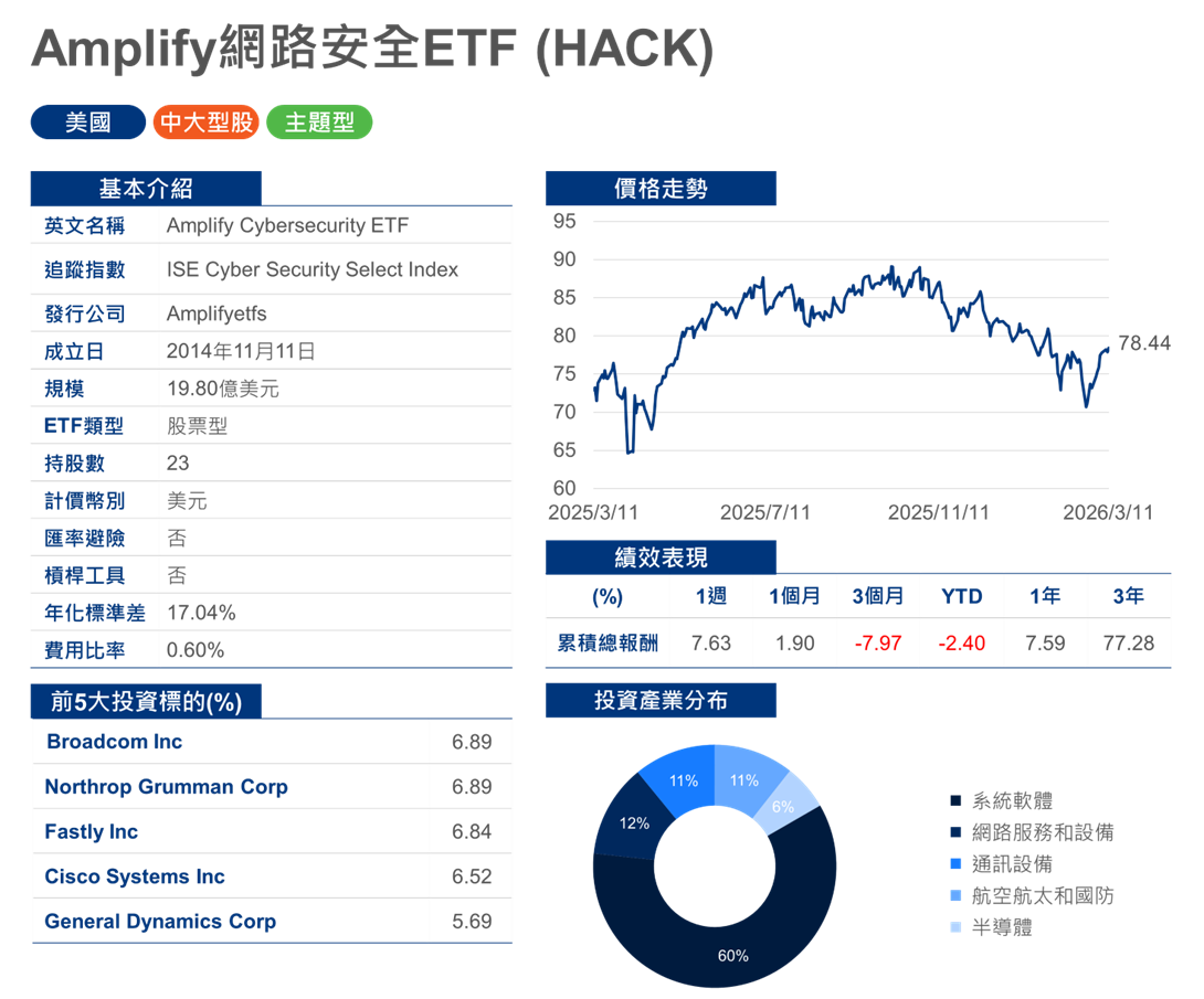 註:上述ETF為美國市場上市ETF,以篩選網路安全ETF資產管理規模前2大者,資料截止日2026年3月11日。
