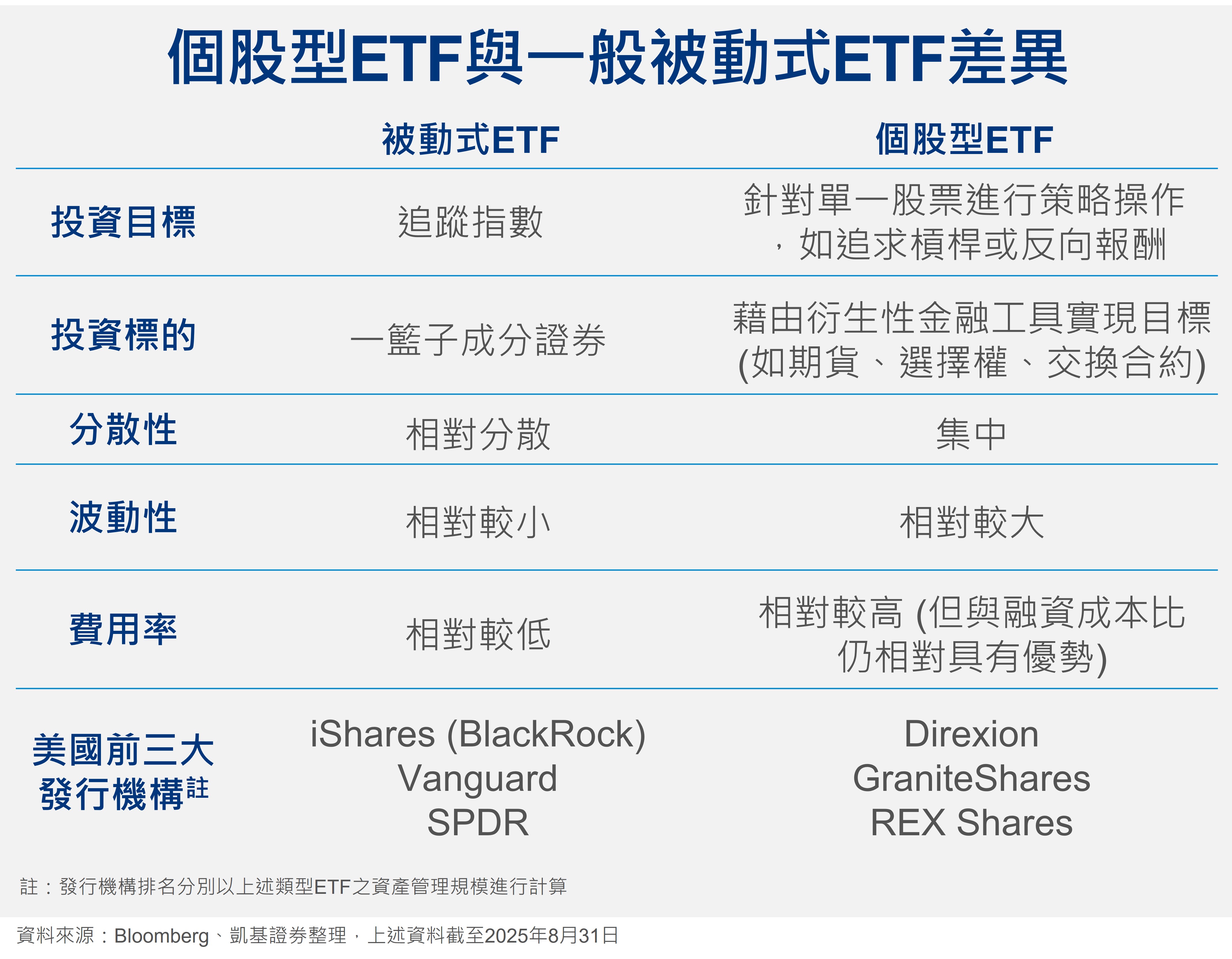 個股型ETF(Single-stock ETFs),打破對於過去ETF分散投資的概念,針對單一股票進行策略操作,由於波動性較高,普遍較適合作為短期波段操作使用。