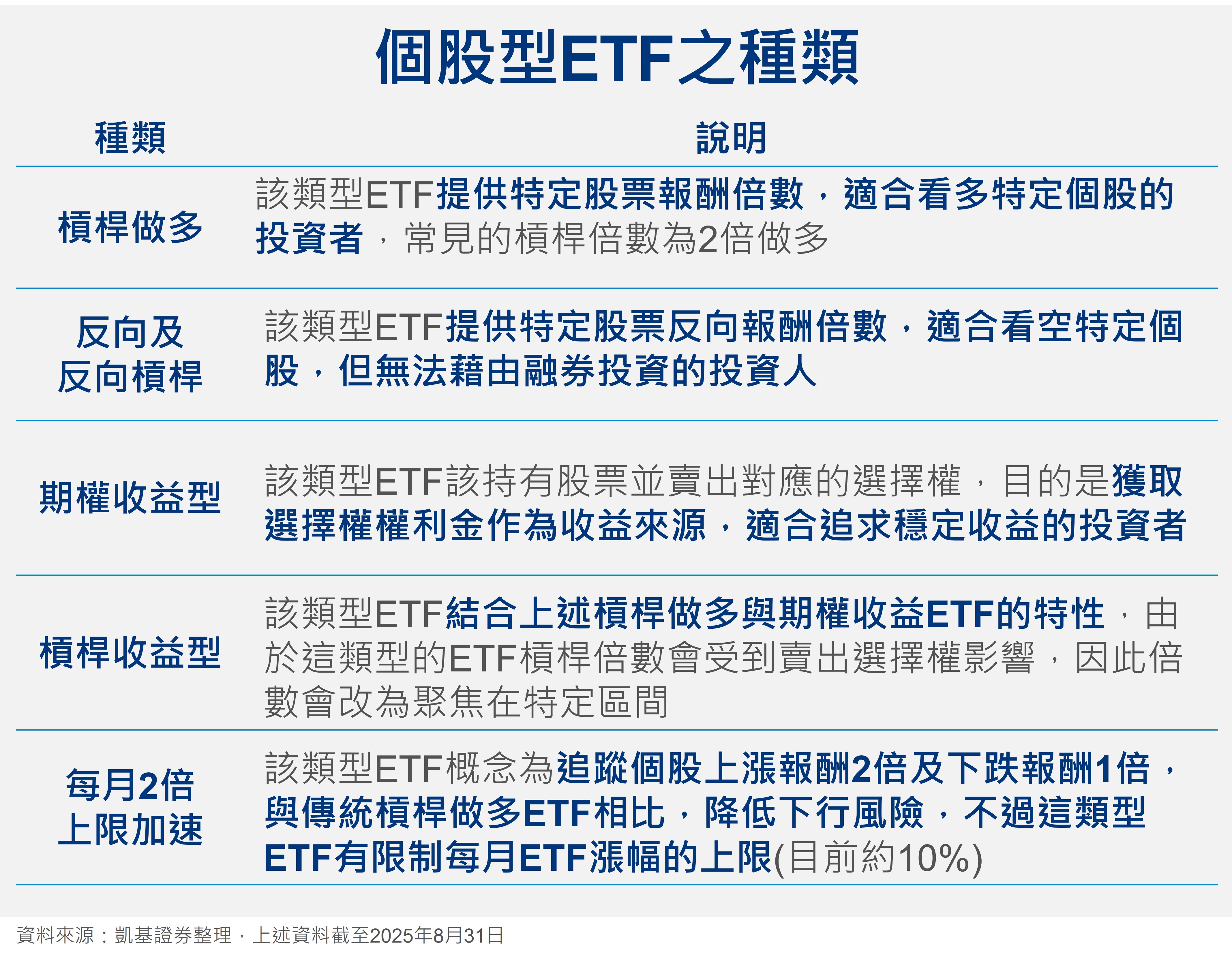 目前個股型ETF主要有5種類型,除了常見的槓桿做多、反向及反向槓桿類型外,也有以期權收益、槓桿收益型及每月2倍上限加速的個股型ETF。