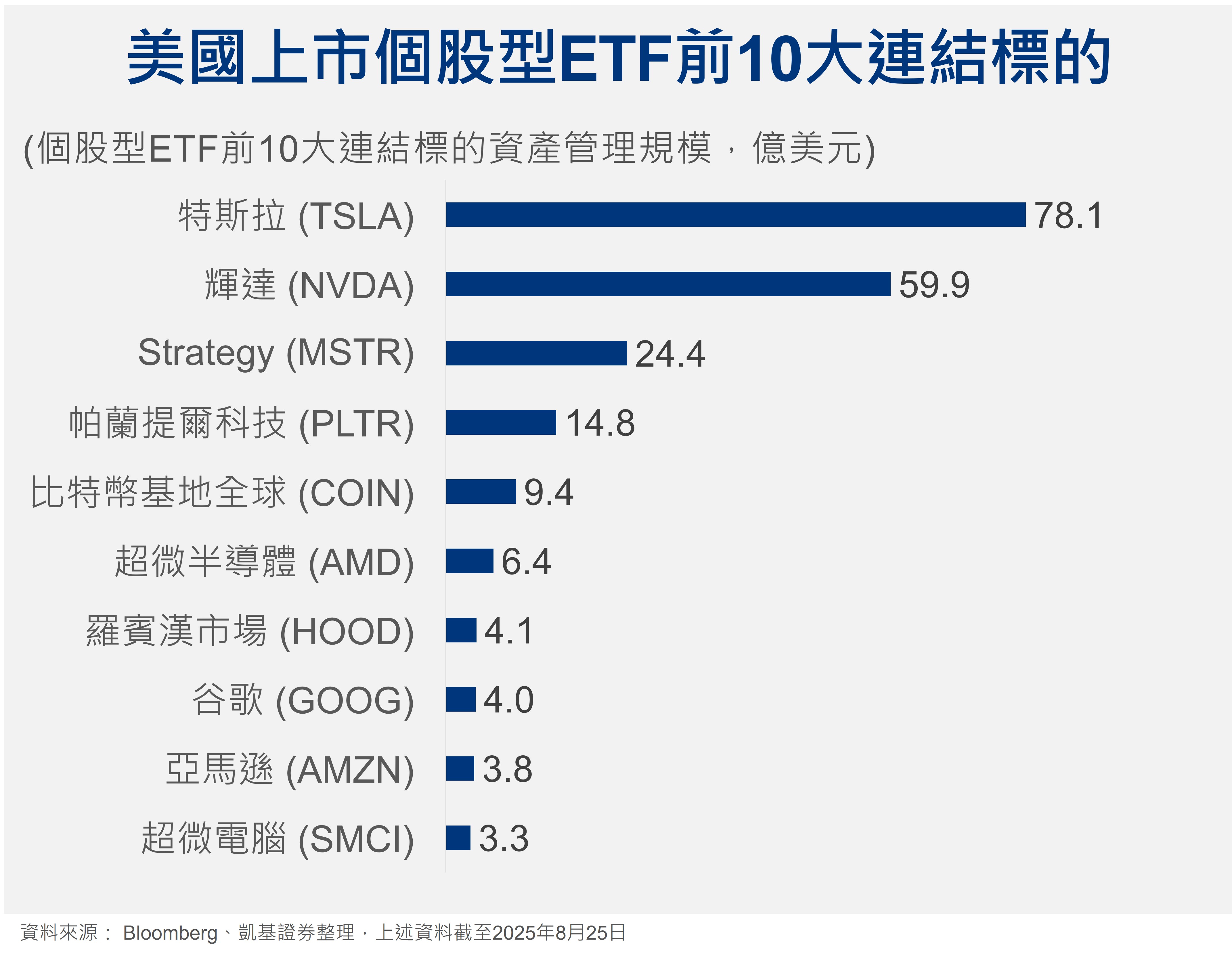目前美國市場上市相關個股型ETF已將近200檔,連結超過80檔個股標的,合計資產管理規模超過240億美元,但規模高度集中在熱門標的。