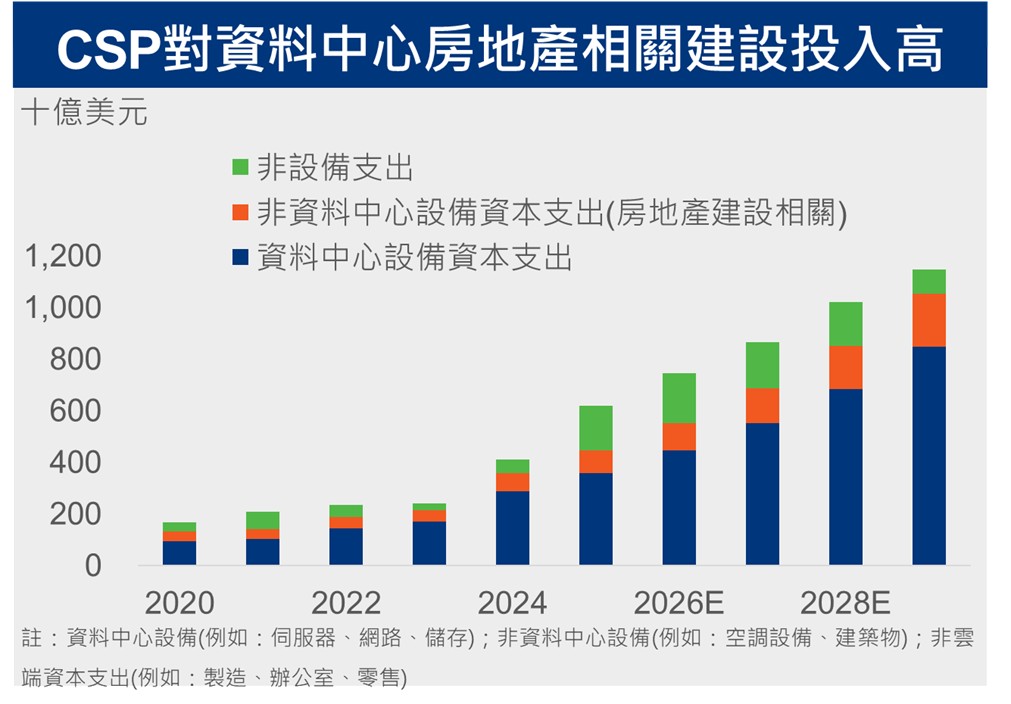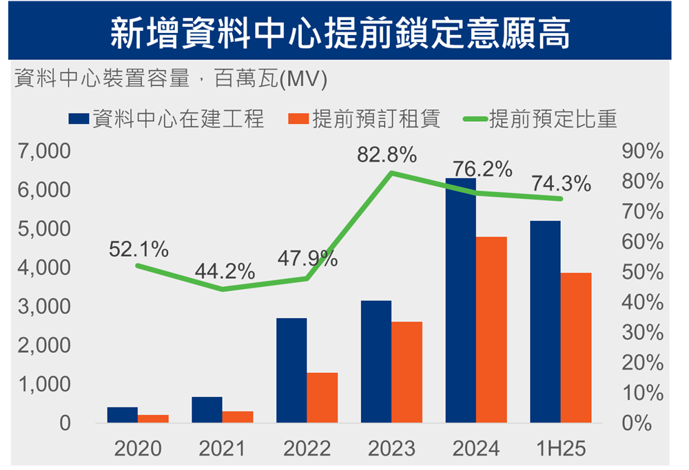 📌雲端服務商(CSP)對資料中心資本支出投入高,除了資料中心設備(伺服器機台、晶片)投入,資料中心其他設備(新建廠房與土地)投資也不手軟,未來5年複合成長率達28%高於前者24%。截至2025年上半年資料中心預計新增容量超過5,000MV,已逼近2024年全年,即便供給端在建工程大增,CSP廠仍積極預定未來容量,從2023年AI大型語言模型興起開始,提前預訂未來容量比重皆高於70%,隨著新資料中心陸續完工,強勁需求有機會帶動租金也同步上漲,有利相關房地產開發運營商獲利表現。