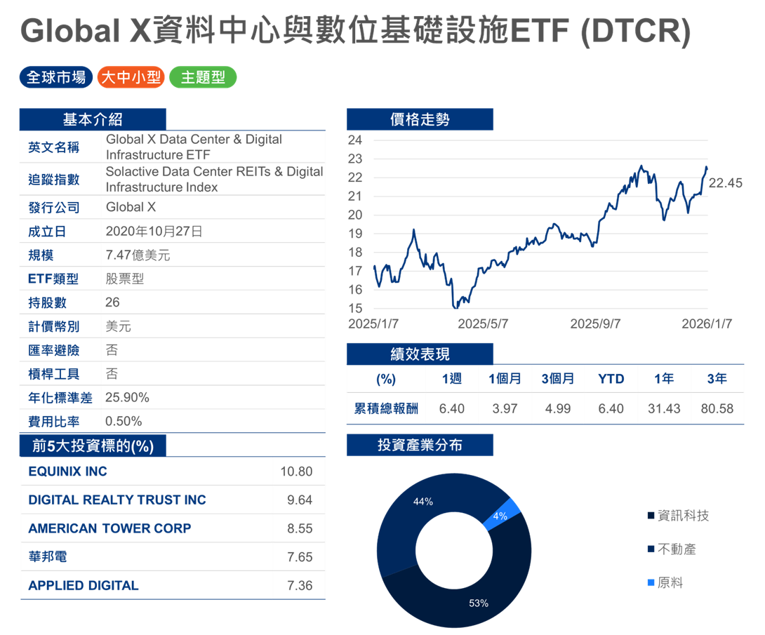 註:上述ETF為美國市場上市ETF,指數編制概念以數位基礎建設為主題。以市值規模最大之前兩檔ETF作為範例介紹,資料截止日2026年1月8日。
