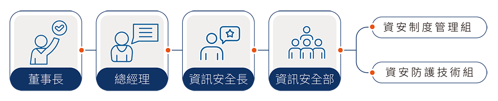 為提升組織之資安意識,本公司派任由副總經理階級擔任資訊安全長,並聘請具資安背景之外部顧問實際參與董事會,定期辦理董監事資安課程及分享產業之資安風險議題,協助組織將資安風險納入經營決策考量,自董事會由上而下推動資安風險治理策略。依據法規之訂定本公司實收資本額分級防護標準,而為落實資安管理及深耕資安文化,資安之組織已於2023 年度成立資訊安全部,落實組織內部之資安政策推行及把關組織之資安防線。