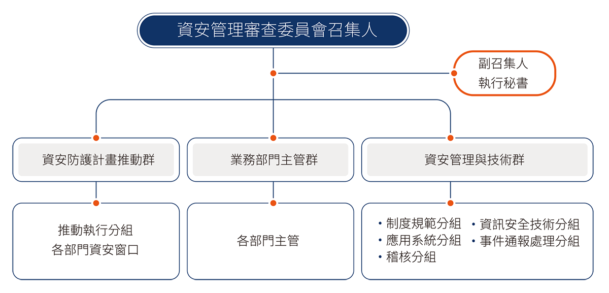 凱基證券於2016 年先行成立資訊安全推行小組,統籌ISO 27001 管理及資訊安全相關議題,因應2023 年資訊安全部獨立為部門,故將資訊安全推行小組提升層級為「資安管理審查委員會」,由凱基證券總經理為召集人,營運長及資訊安全長為副召集人,該委員會屬內部任務型之組織,向相關單位定期報告組織內部執行資安工作之推行進度,向董事會則定期於每年度陳報組織內部之資訊安全整體情形,且每年度至少舉辦三場會議,負責年度資安管理審查會議之議事程序、會議決議執行事項以及資訊安全管理制度執行成果之審查管理等。