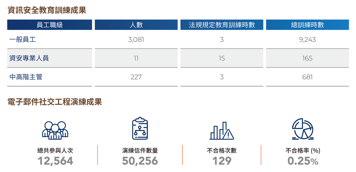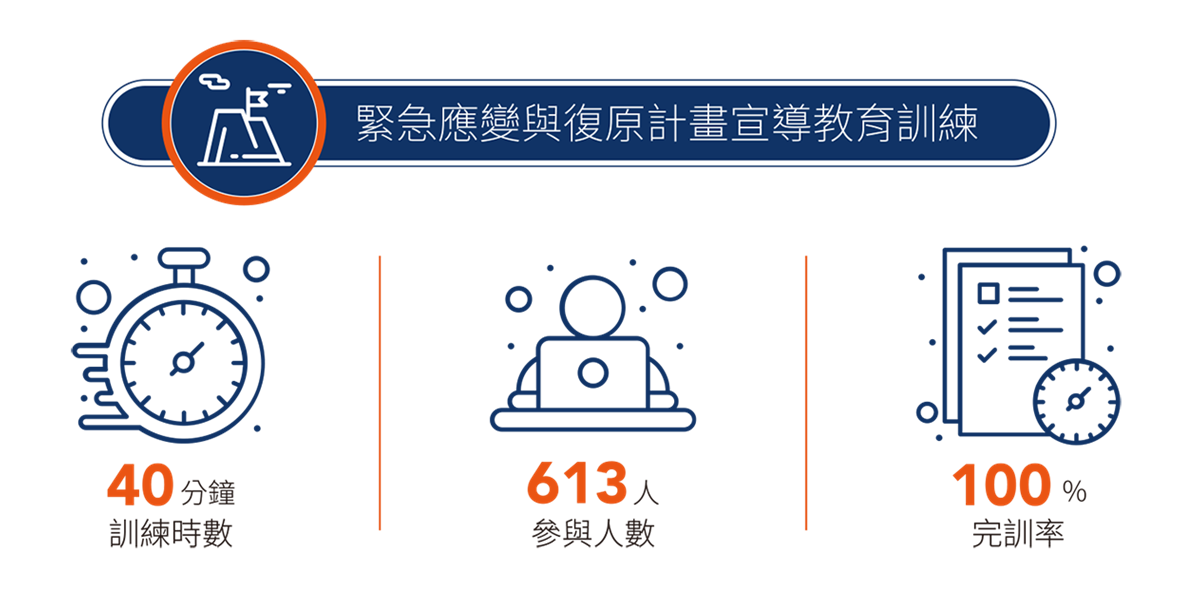 本公司亦依據該政策成立「營運持續管理小組」,配置專職人員,以規劃營運持續政策、分配安全責任、協調全公司之營運持續計畫,並推動營運持續管理體系之運作,及縮短營運衝擊發生時之應變與處理時間。除此之外,本公司所有具備營運持續管理職責之人員,皆受過營運持續教育訓練並定期執行相關演練,以確保各項營運持續步驟能達成預設的營運持續目標。除專職人員外,本公司亦將營運持續管理課程納入新進同仁教育訓練,並定期安排緊急應變與復原計劃宣導教育訓練,以強化同仁對於營運持續管理制度的認知。