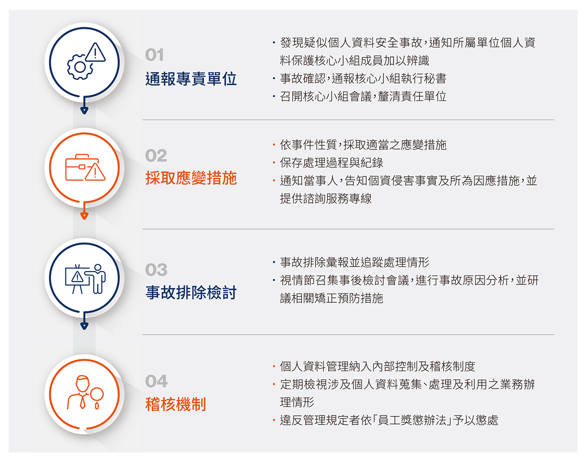 本公司法令遵循部依《個人資料隱私衝擊分析及風險評鑑要點》辦理 2024 年度「業務流程識別及個人資料盤點作業」與「風險評估作業」完竣。依盤點及評估結果,本公司各項作業流程所涉之個資風險皆為有效控管。為進一步徹底落實個資保護,本公司已就個資業務流程進行檢視,經檢視並確認各單位已參考前述處理要點完成「個人資料流程作業風險評估表」,後續由核心小組進行風險排序,並評估本公司可接受風險。最終由核心小組執行秘書選派人員,就前述評估結果,撰寫「個人資料保護管理制度之定期自我評估報告」,提交核心小組討論後,業經陳請總經理核定,經上述流程,本公司已可有效控制前述業務流程所衍生之個資風險。