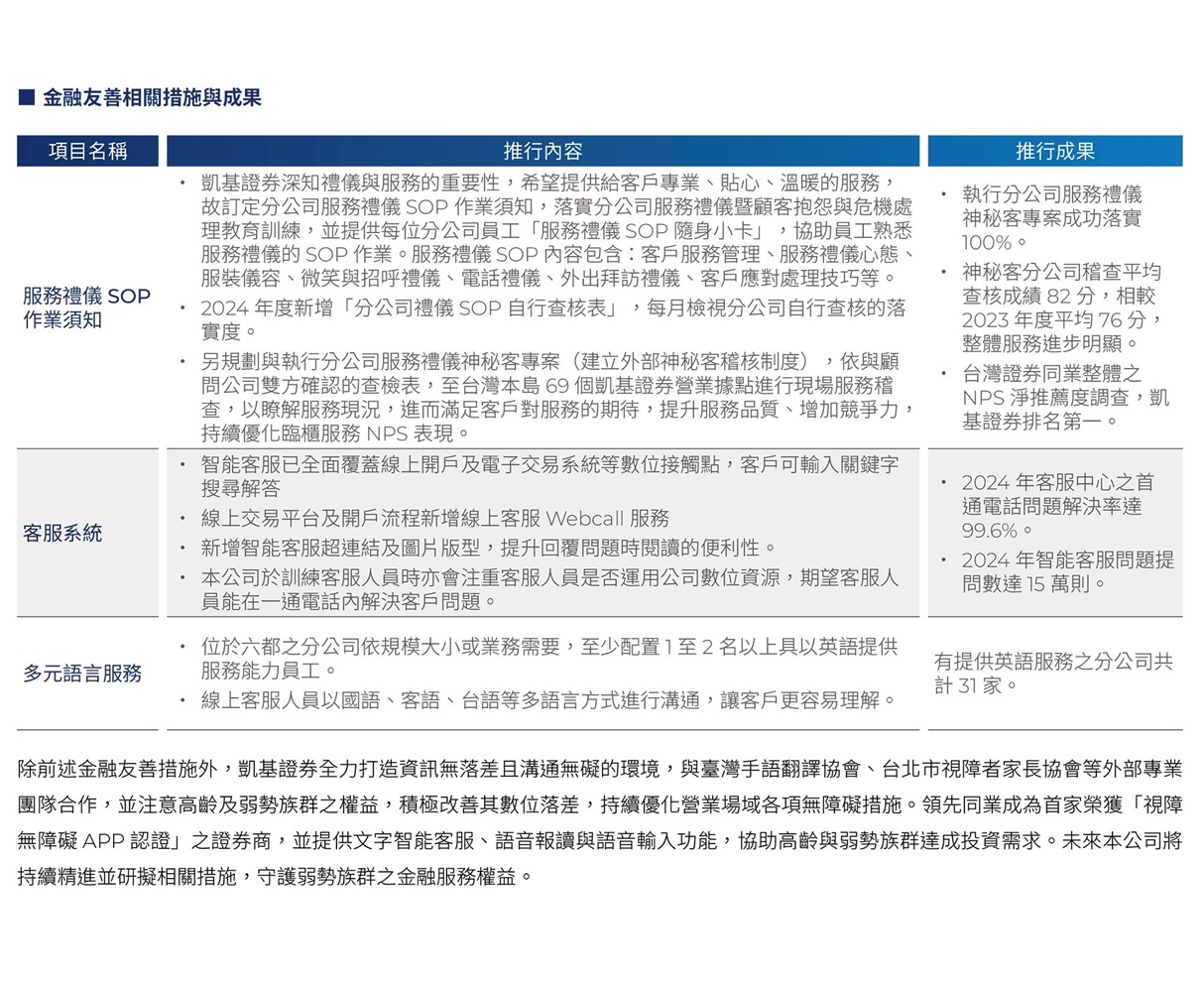 本公司致力落實「以客戶為中心」的核心價值,於金融友善服務領域持續領航,今年(2025年)再度榮獲金管會「公平待客原則評核」大型綜合券商前25%頂尖佳績,彰顯凱基證券自上而下推動公平待客,於金融消費者權益保護、數位友善服務及企業誠信經營等面向的卓越成果,深獲主管機關肯定。